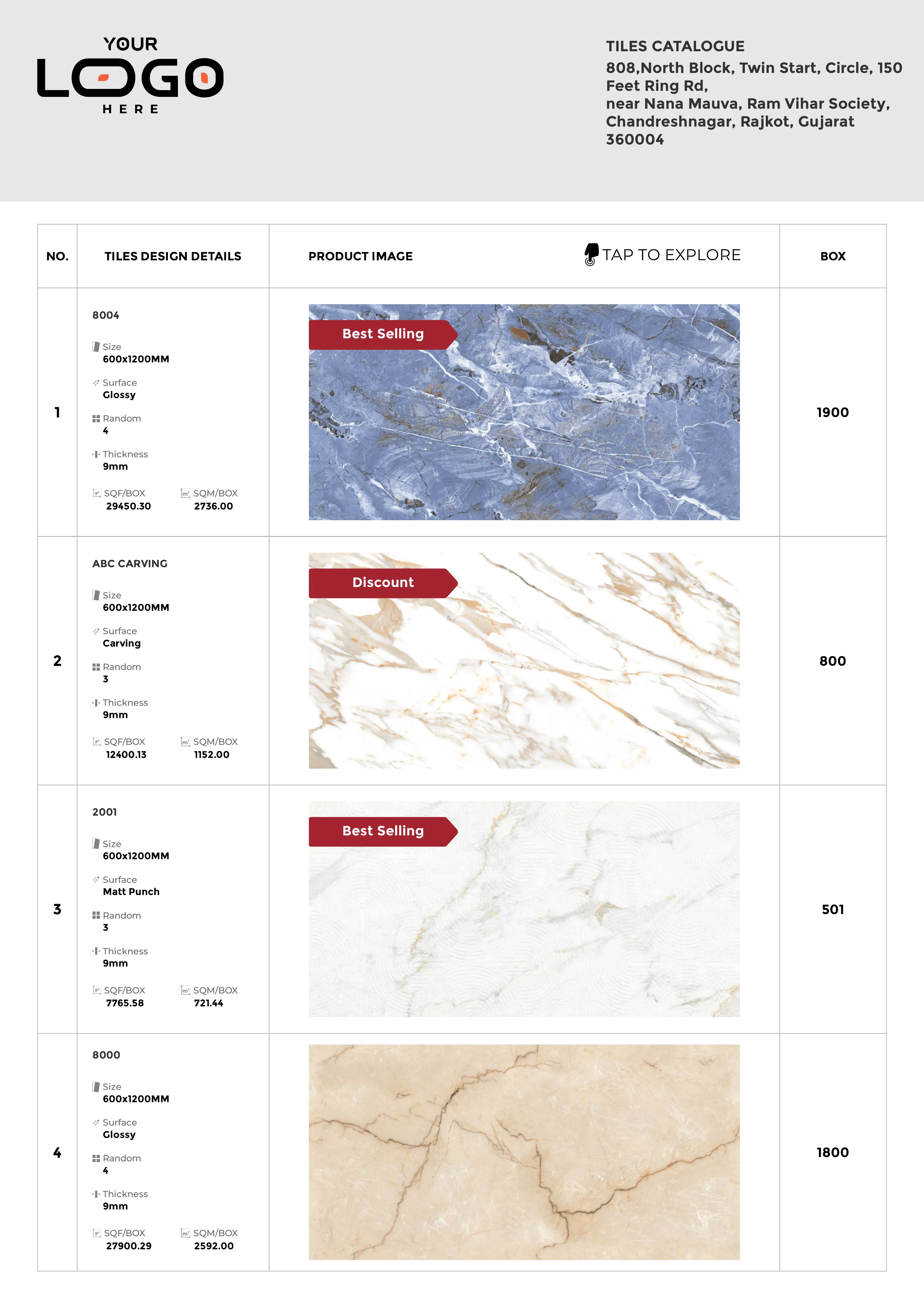 Create customized catalogues based on client preferences, project needs, or purchase orders (POs). Include multiple tile sizes in one catalogue, making it highly personalized and effective for closing deals.